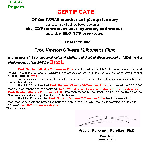 A IUMAB Internacional concedeu ao Prof. Newton Milhomens e a Dra. Selma Milhomens autorização para ministrarem Cursos Avançados para a formação de Concessionários Autorizados com a finalidade de maior divulgação da Bioeletrografia nos meios científicos e acadêmicos.
